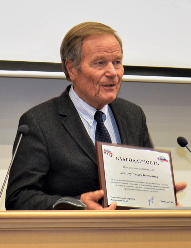 Клаус Бонеманн поблагодарил за награду и подчеркнул роль НААГ как организации, которая артикулирует и отстаивает интересы производителей автоклавного газобетона, объединяя усилия отдельных предприятий.